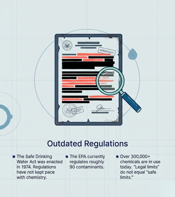 Congress enacted the Safe Drinking Water Act in 1974, but regulations haven't kept pace. The EPA regulates roughly 90 contaminants, yet 300,000+ chemicals are in use today.