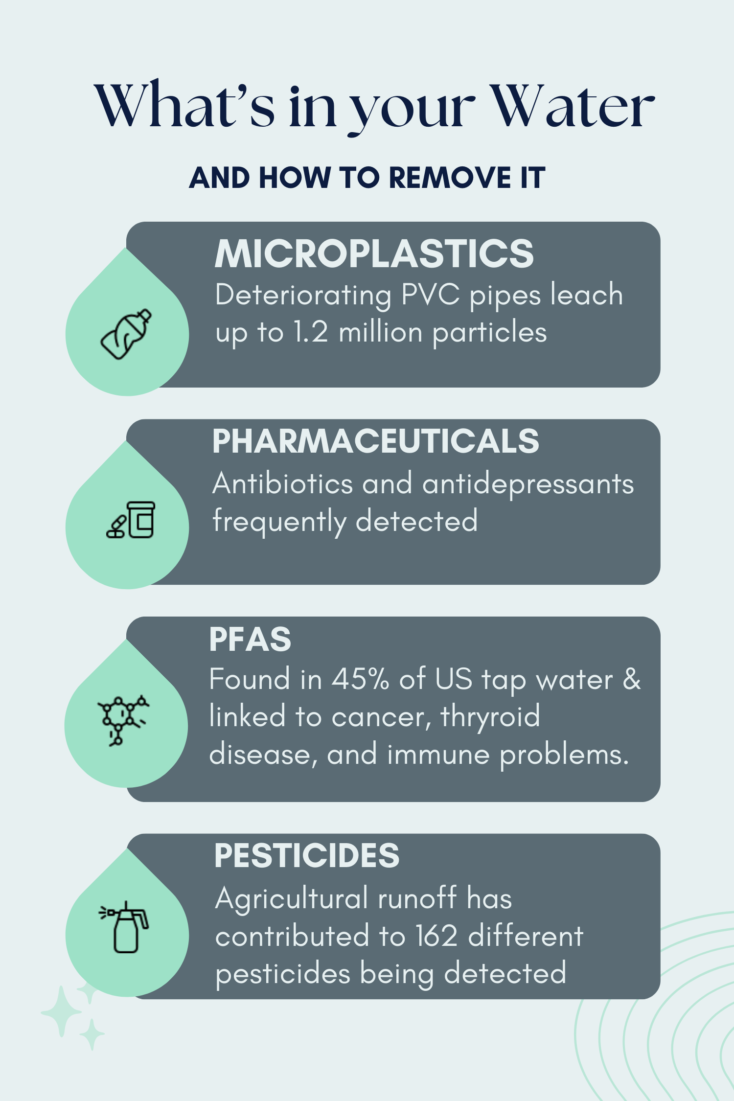 Your water may look and taste fine but still harbor invisible contaminants. Pollution enters at the source, during treatment, or through your home's pipes. Old infrastructure and regulations allow for harmful chemicals into our drinking water.